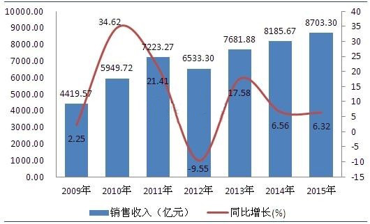 近年來,我國儀器儀表行業(yè)市場規(guī)模實現(xiàn)了快速擴張。據(jù)《中國專用儀器儀表行業(yè)劃分析報告》數(shù)據(jù)顯示,2011年達到7223.27億元,同比增幅達到21.41%。2012年,我國儀器儀表行業(yè)市場規(guī)模同比有所縮減,降至6533.30億元,同比下降9.55%。2013年以來,我國儀器儀表行業(yè)產(chǎn)品銷售明顯回暖,到2015年,我國儀器儀表行業(yè)銷售收入為8703.3億元,同比增長6.32%